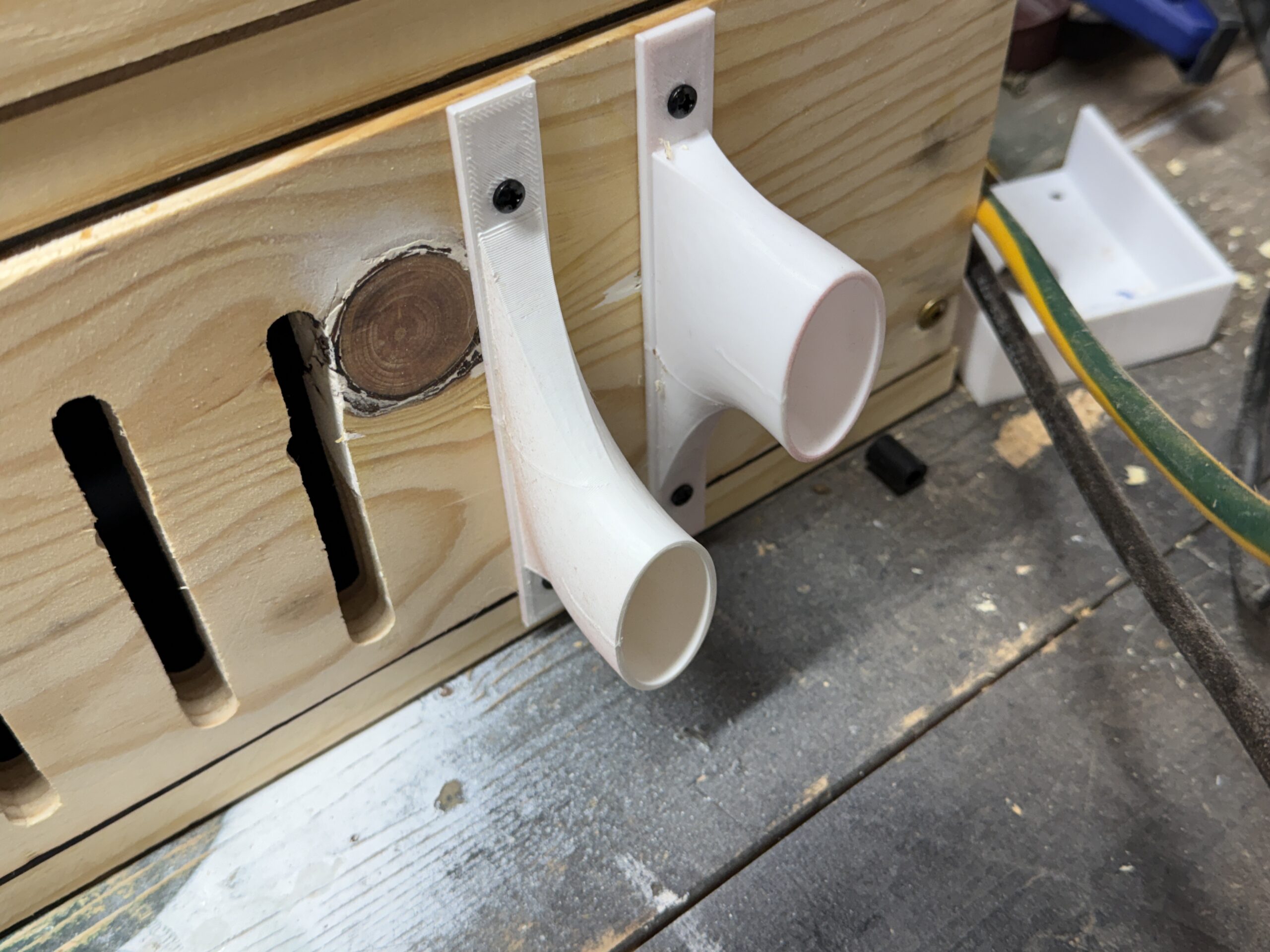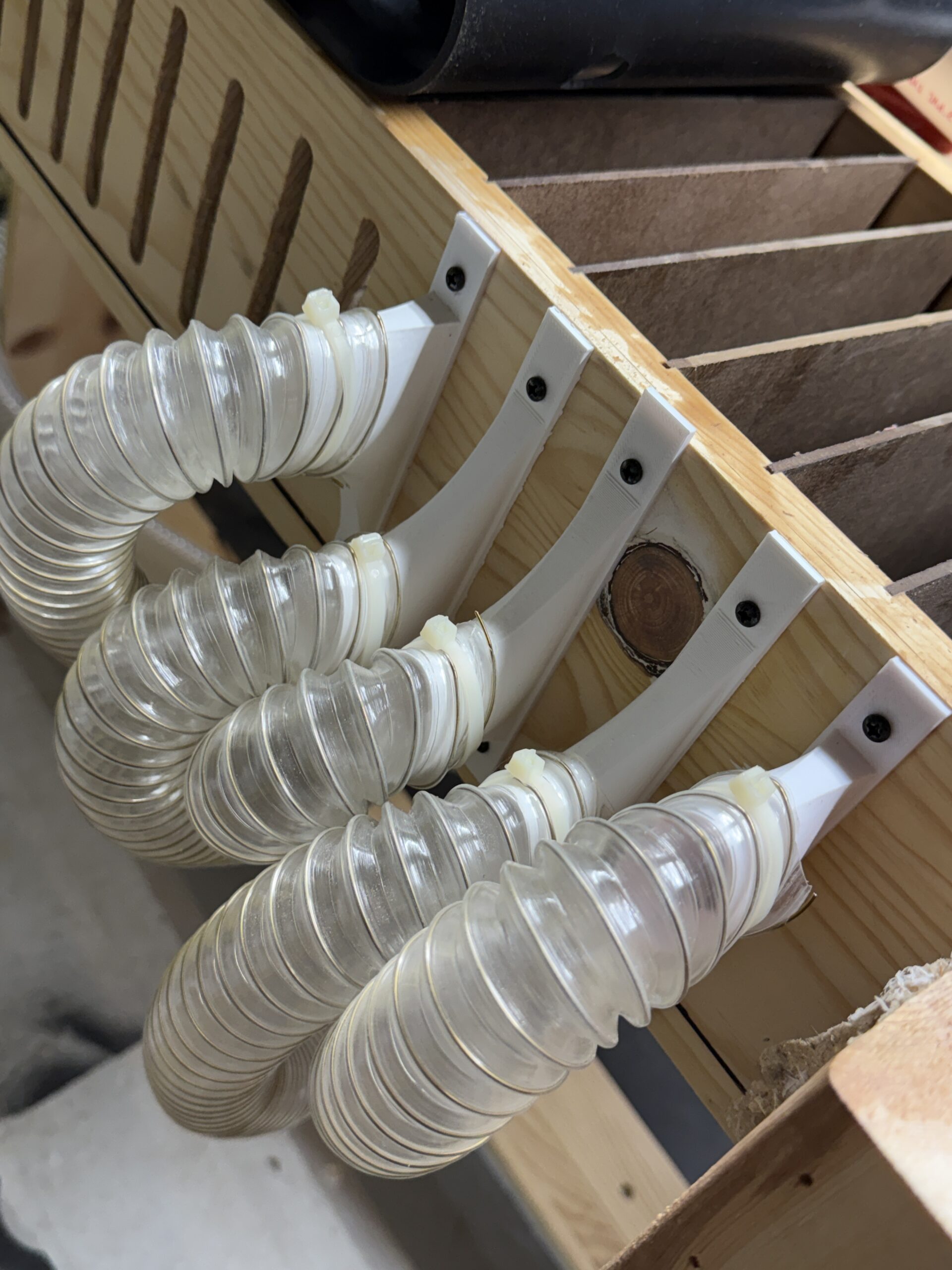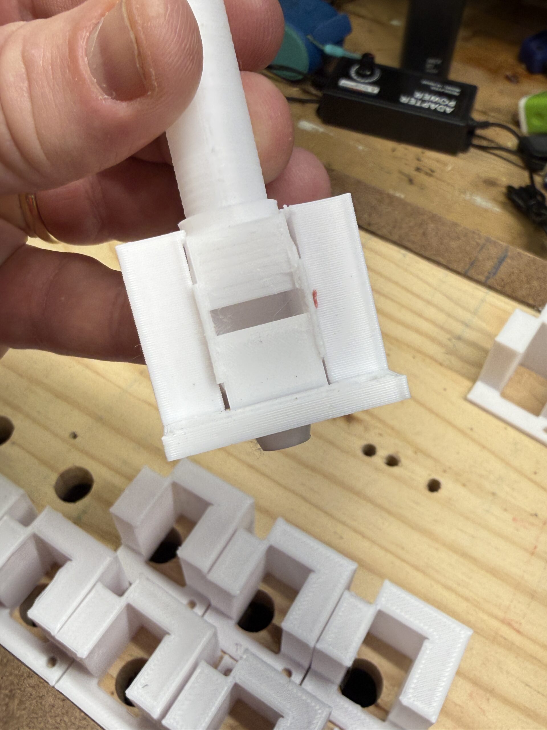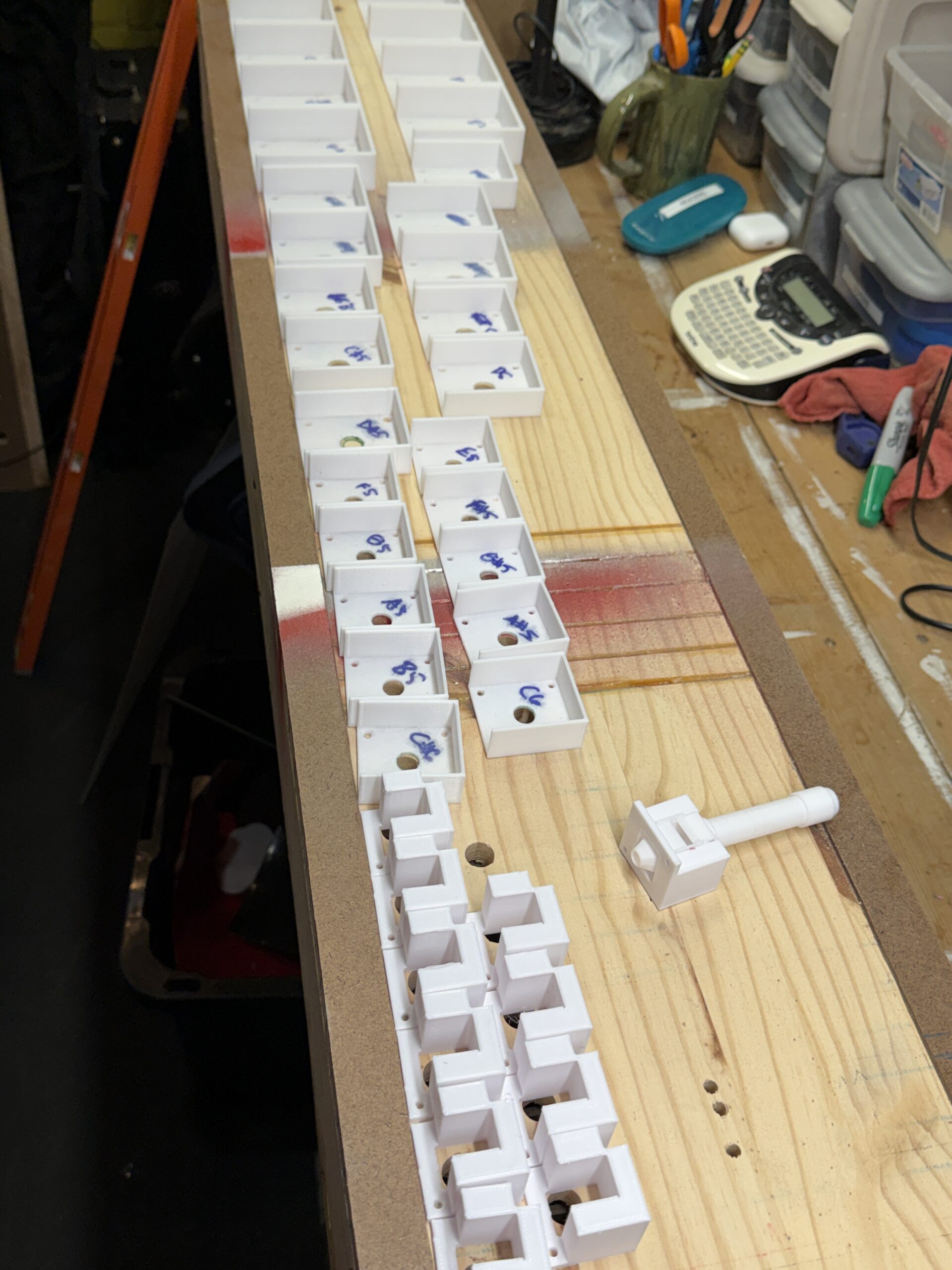 Me glancing up from trying to deal with aligning the pallets in the windchest. One of the first photos of the wind reservoir.Wind reservoir with a hinged topThe wind reservoir with air inputI used sheet vinyl from the craft store to make the “bladder” on the wind reservoir and the lid is weighted with spare weight plates from my workout gear. This is blow-and-dump; the reservoir fills and once full opens a valve at the bottom to dump the excess air.My very first pressure gauge in literal inches of water. I upgraded to actual wc/in gauges after this but it was fun to see in principle.Wind reservoir complete, first iteration. This is still in service, just with a downstream fine tuning from the wind regulator.My blower (for now); a retired inflatable jumpy castle blower, which works rather well, and is designed for partially-static loads and long duty cycles.The wind regulator/reservoir inline with the blower.The wind regulator; unlike the reservoir, this has a spring-loaded bladder and the center pin pulls a 3D-printed plunger that opens/shuts the air valve based on the spring loading. Right now it is tuned to 2″ WC.I think this is iteration….2?…of the keyboard? I reprinted the keyboard 3 times, redesigning the keys each time (from scratch, nobody had 3D printed a keyboard before).One of many keyboard printings.An initial pipe printed off the original posting on Thingiverse; I went from here to modify it to PVC piping.Not my first pipe but a complete one. You’ll notice the mouthpiece is a circular one; not what I ended up for the final design for this rank, this is more of a flute/whistle rank sound.One of the pipe mouths that I started to print; this was the design that I eventually settled on.The first mouth for 1.5″ PVCA couple of pipes that work.A large pipe with a very, very small pipe on top.A good portion of the first rank printed and assembled.A “family photo” of the completed first rank, C2 through C7.This is pallet board…..4? 5? I tell you, if I never have to design another windchest……but I’ve learned a lot? I guess?2nd or 3rd pallet board drilling. I think I’m on the 4th or 5th now.Placing and cutting proper slots for the windchest is an effort in patience and frustration.Working out how to lay out the windchest pallets. This was a nightmare to sort out. I eventually redesigned and reprinted the keyboard to have even spacing so the pallets would also be even-spaced.Winchest pallets Mark I setup. I used aluminum angle stock to provide the upper stop for the springs and to give some rigidity. I’ve now completely torn this down twice.A few of the pallets in the windchest from the side. These have now all been reprinted yet again.Adding self-adhesive craft felt to the pallets as a seal against the air channel slotsMark II of the assembled pallets; they are lined up on a center line so they are interweaved.A closeup of the pallet/spring setupShowing how the aluminum corner stock is above the pallets to contain the springs. The pallets hinge on a metal rod and are spaced with 3D-printed spacers.Troubleshooting leaks on the windchest. Note the 3D printed piping flanges, some removed to debug leaks.Fitful attempts to remediate pallet leaks; leaks would be ok (I have plenty of air) but the pipes speak in low whistles so it’s a no-go until solved.FINALLY redid the slots a third time and reassembled AGAIN and I get consistent pressure and few leaks. I still have some whistling pipes but that will be solved downstream.The assembled windchest. One side is clear acrylic so I can see what’s happening, the rest wood. The wires that pull the pallets are model airplane control surface wires; stiff but thin. 3D printed guides seal off all but right around the wires.Toeboard on the left where the pipes will mount; stop slider on the right. The thin sheet will slide between the two heavier to turn on/off the stop by the stop pull.Scoring the toeboard to interface with the pipe chest; I will ultimately move away from this due to the difficulty.The pipechest with the dividers for each air channel.The completed toeboard with stop slider sandwiched in middle.Testing out the placement of the pipe interfaces on the side of the pipechest channels; the windchest will connect to the pipechest via flexible hoses.Re-aligning and re-cutting the pipechest toeboard; I had to align to some channels below it in alignment as well as just redoing some of the sealing properties.One of the custom-designed brackets that holds the tiny pipes; because they are so light (printed PLA+) just sitting them on a hole isn’t possible; this bracket holds them firm without a permanent connection.The bracket with a pipe embedded; this screws over the chest hole where comes the wind.On the pipe chest, these are the 3-D printed hose couplers to each of the air channels.The first 5 air hoses hooked up to the pipe chest coming from the key chest.How it looks inside the pipe chest; the dividers separate the wind for each note.
