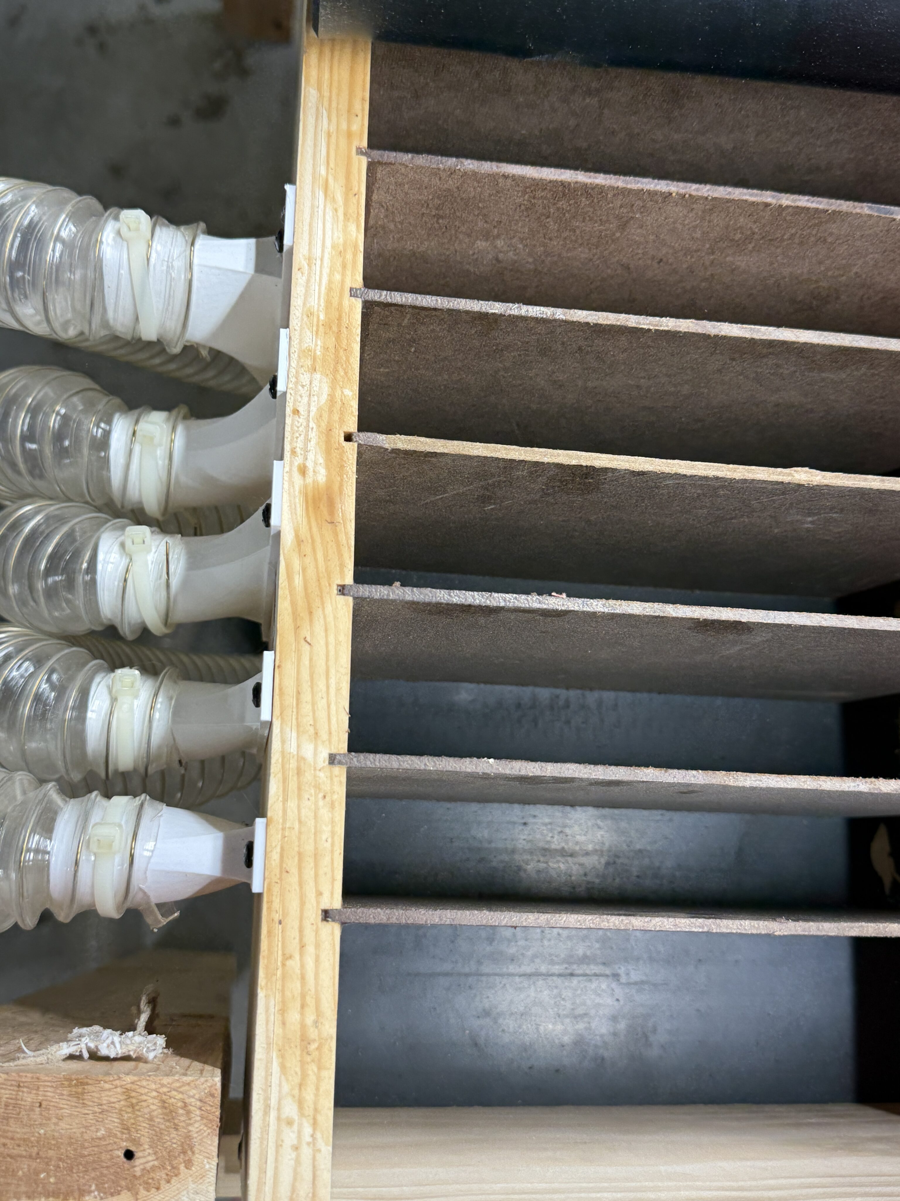 I can now play ~10 notes — A#3 through G4. However, I’m using flexible duct to connect windchest to pipechest and it’s proving to take up too much room, so I’m working on re-engineering my connections to potentially use 1″ PVC instead. Working on templating those so I can test that theory.